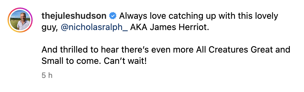 The post says “thrilled to hear there’s even more All Creatures Great and Small to come” hinting that a series five is on the way. If this is so, we can’t wait either Jules!