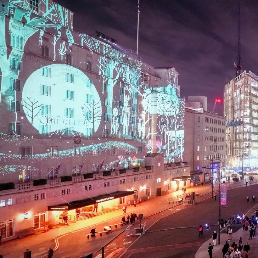 This year’s event takes place on Wednesday 22nd and Thursday 23rd October, celebrating some of the city’s historic civic buildings, modern architecture, and public spaces. Highlights include a projection on the façade of the iconic Queens Hotel, celebrating 200 years of modern railway. Entitled One Second Lovestory by German artist Dirk Rauscher, the piece captures the romantic moment when two people’s eyes meet at a busy train station. The installation is sponsored by Markel.