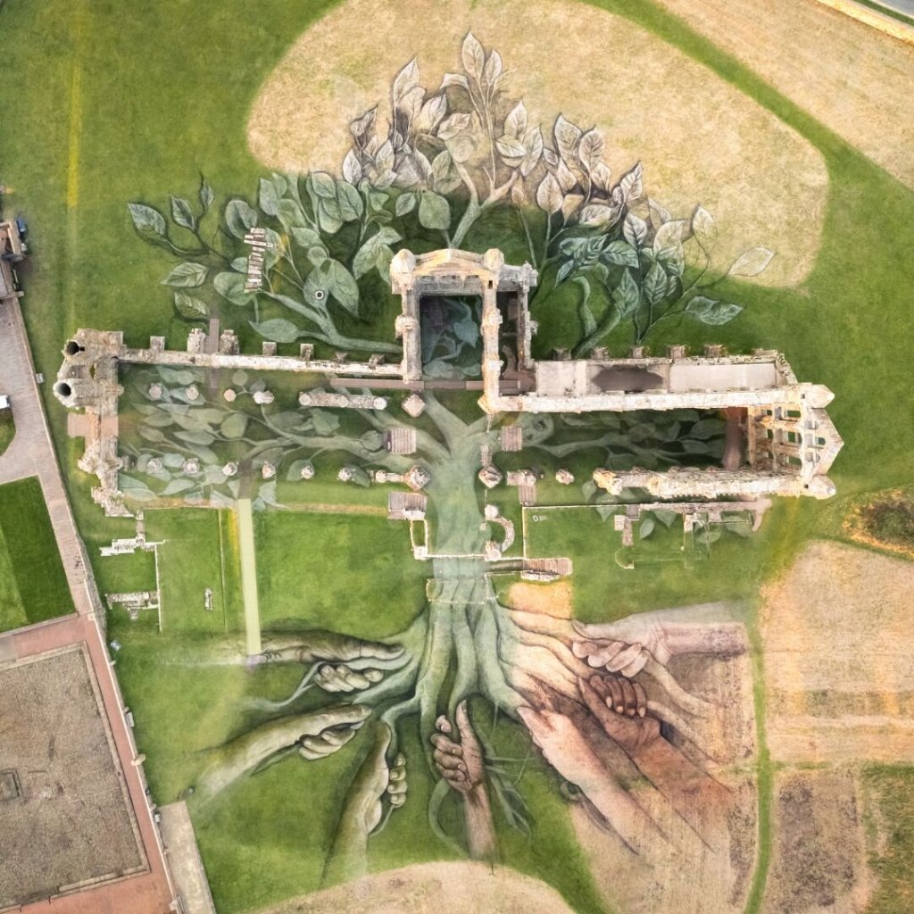 The 5,400 sq m (58,125 sq ft) artwork was created using Whitby Abbey’s landscape, with natural pigments painted on the ground to depict the honourees’ hands holding the roots of a tree.